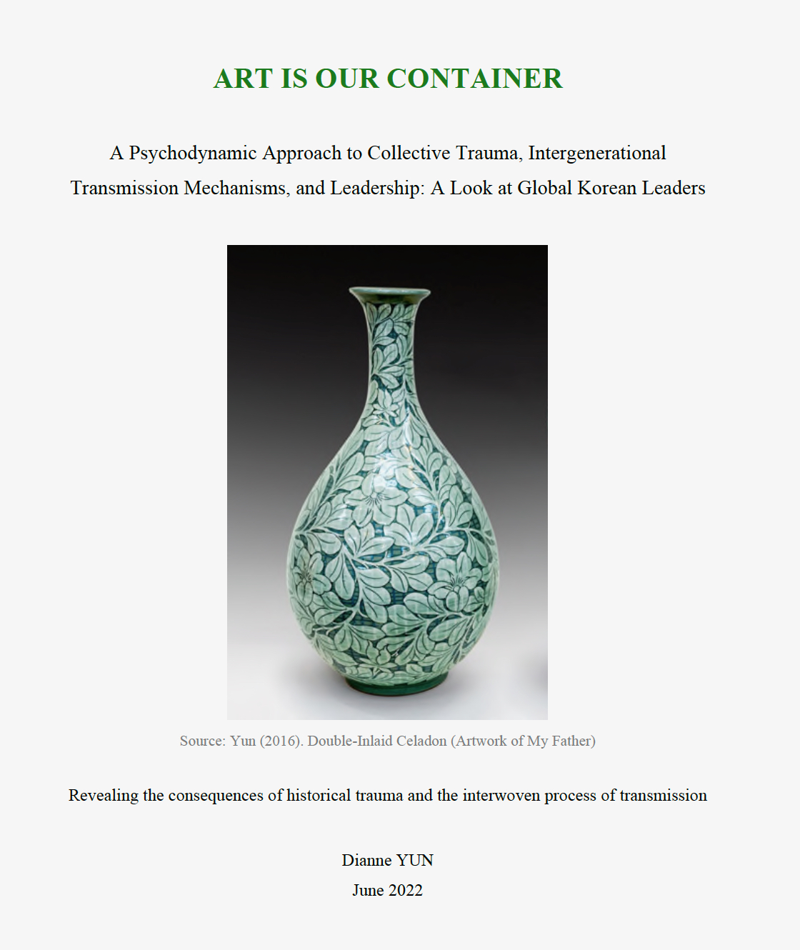 Author of "Art is Our Container—A Psychodynamic Approach to Collective Trauma, Intergenerational Transmission Mechanisms, and Leadership: A Look at Korean Global Leaders"